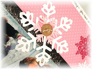 I also used the snowflake die and northern frost sizzlet strip die to cut my snowflakes for the vertical panel. I added dazzling diamonds to the snowflakes randomly with a 2 way glue pen. And then, I accented some of the flakes with designer buttons and the brand new white bakers twine. A strip of whisper white card stock with some journaling rounds up the layout.